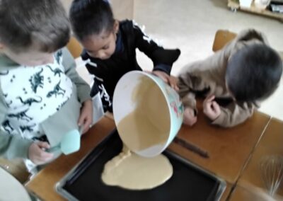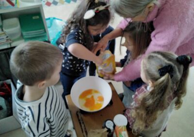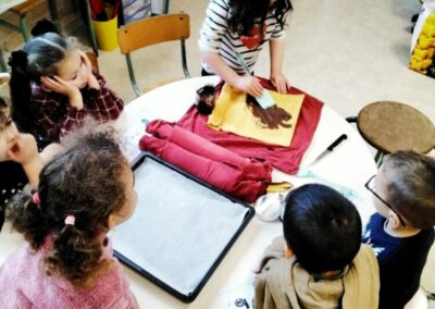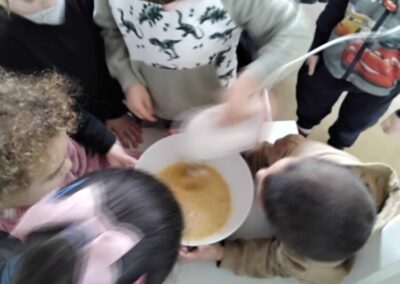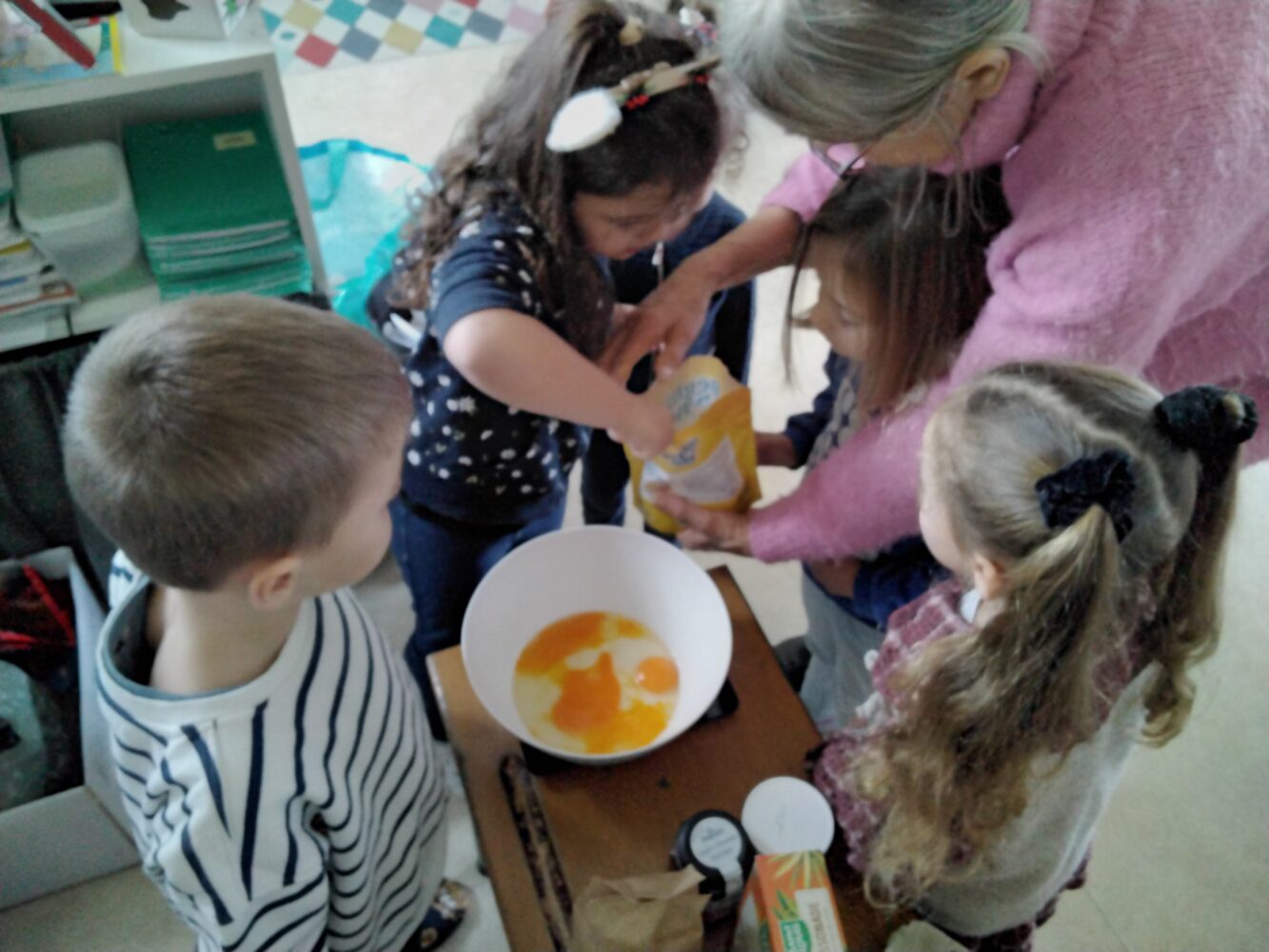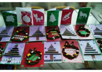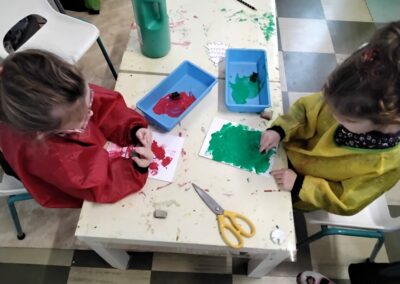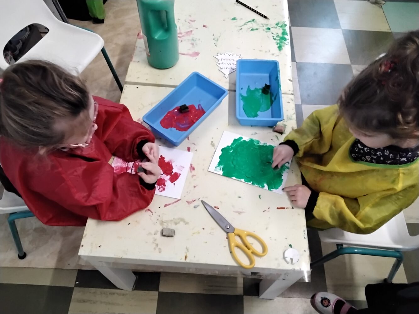 Suite à la lecture du Festin de Noël, les enfants ont suivi les conseils des personnages pour préparer Noël. Pour cela, ils ont fabriqué des cartes de Noël et des couronnes, décoré des sapins, joué aux cartes et même cuisiné une bûche de Noël !