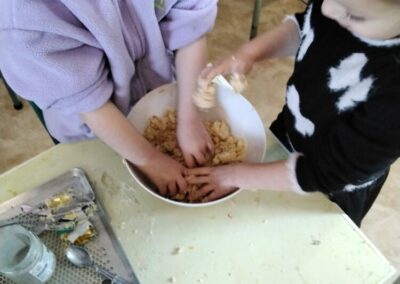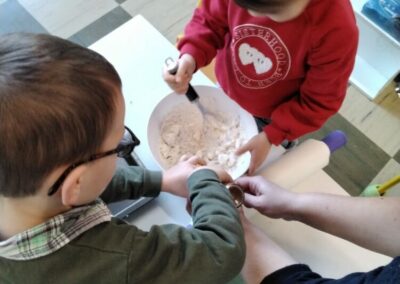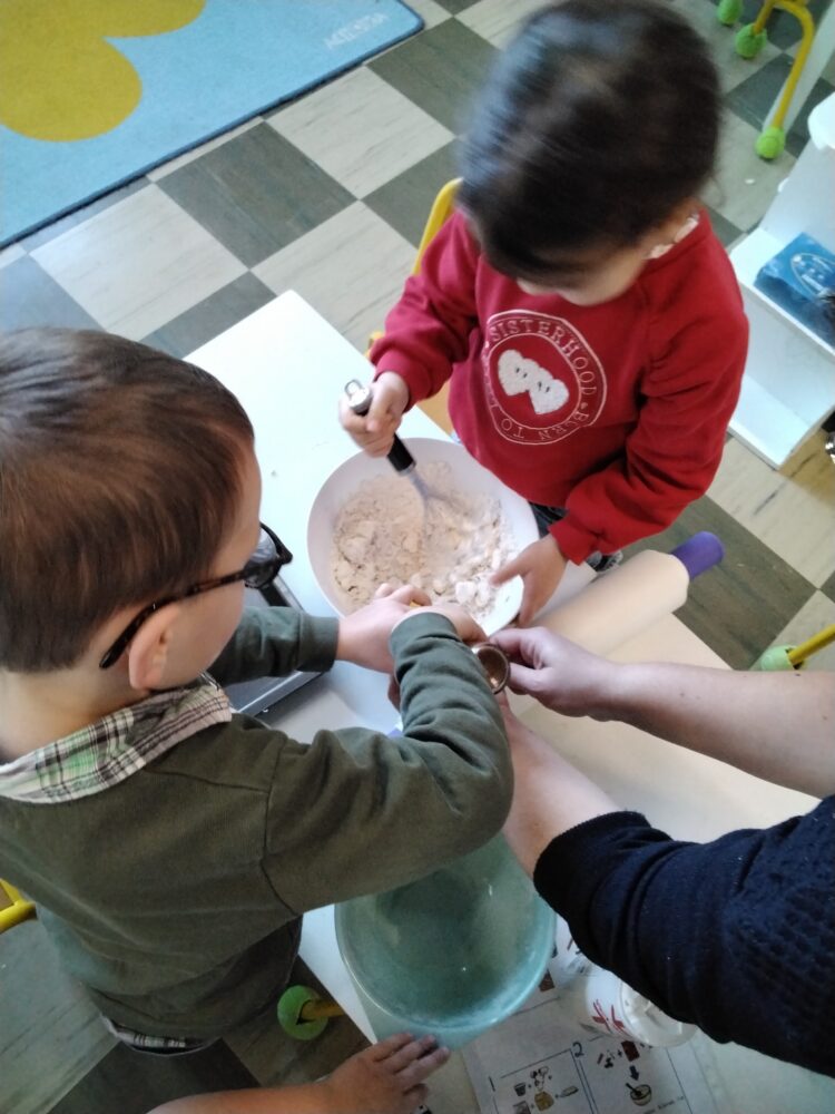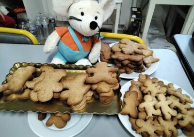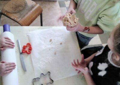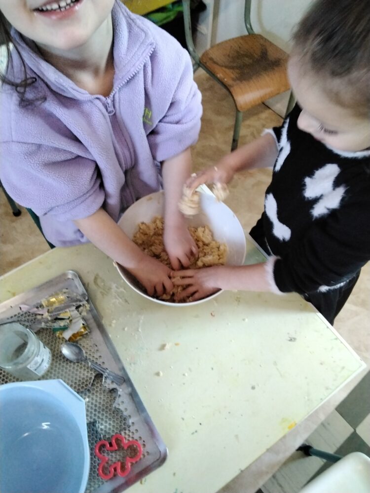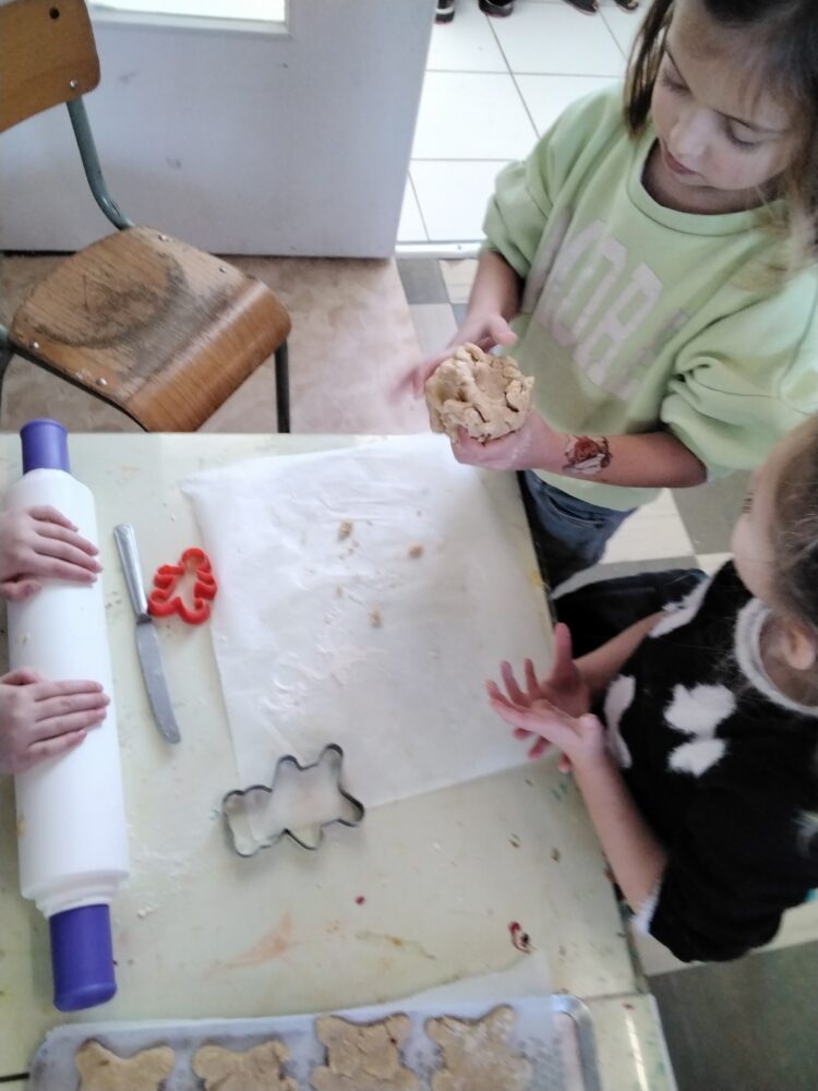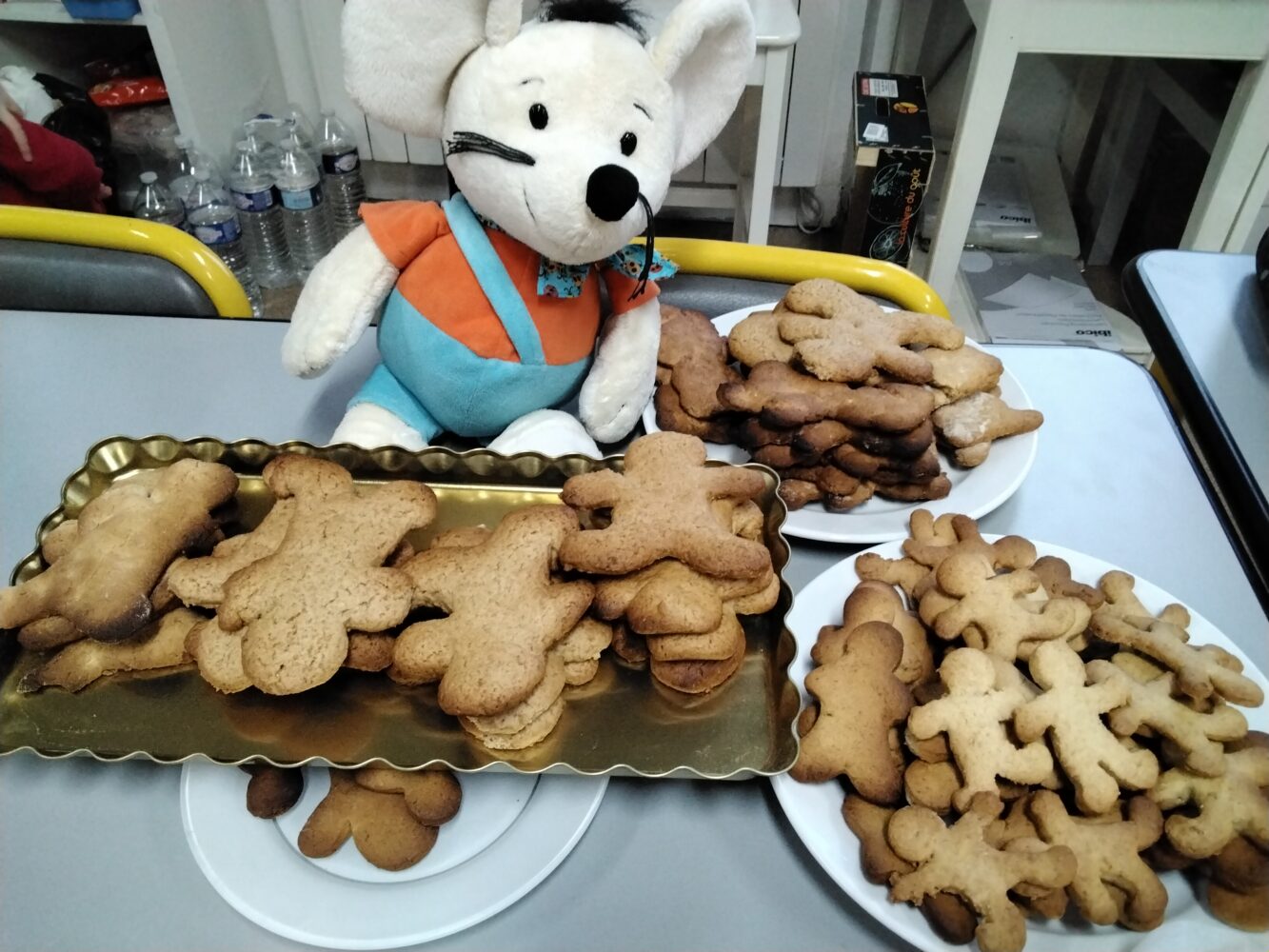 Ce matin, nous nous sommes transformés en cuisiniers et cuisinières ! Au menu, des biscuits pain d’épices. Après avoir tout mélangé, nous avons étalé et aplati la pâte pour former de véritables bonhommes de pain d’épices.